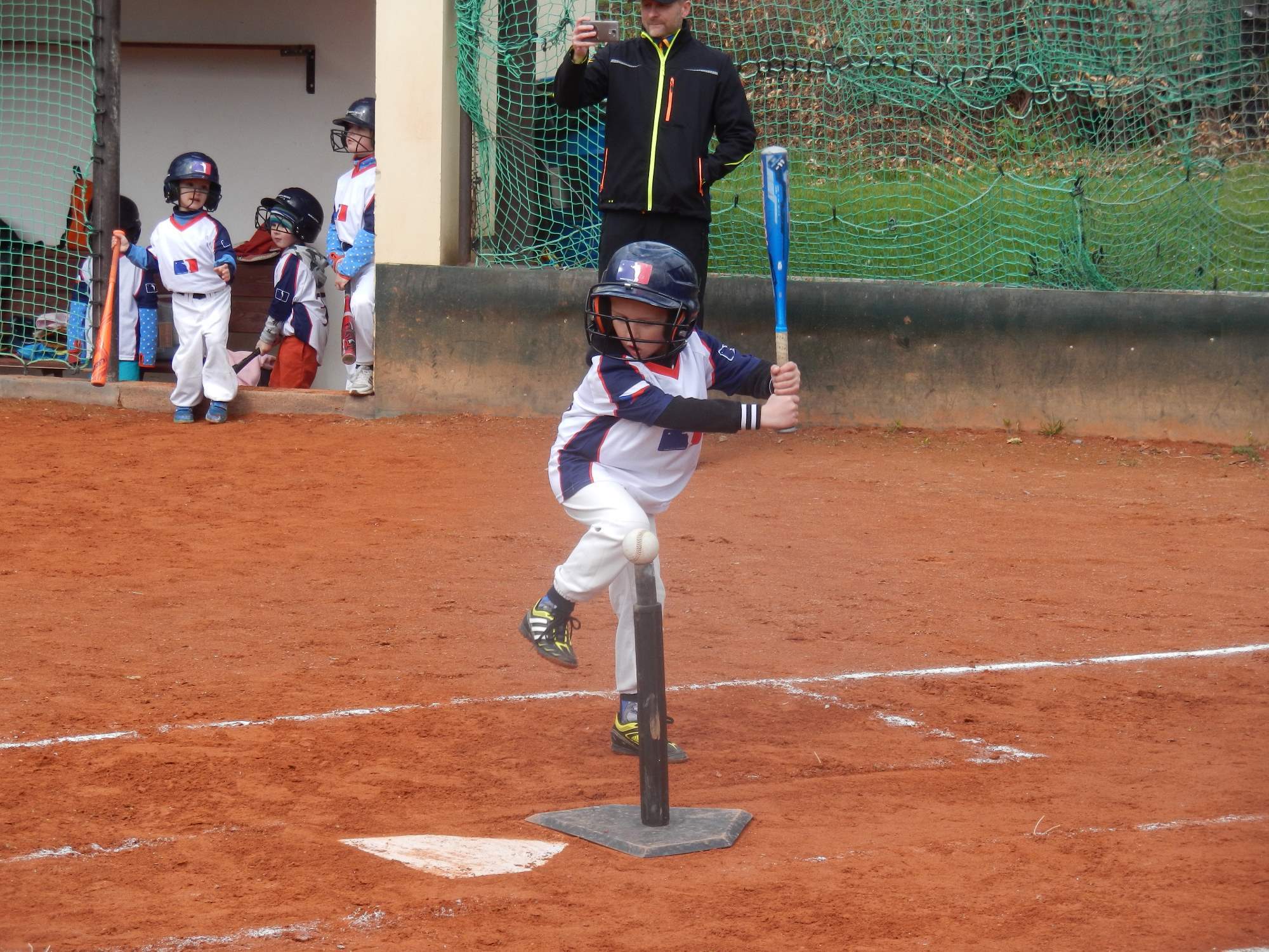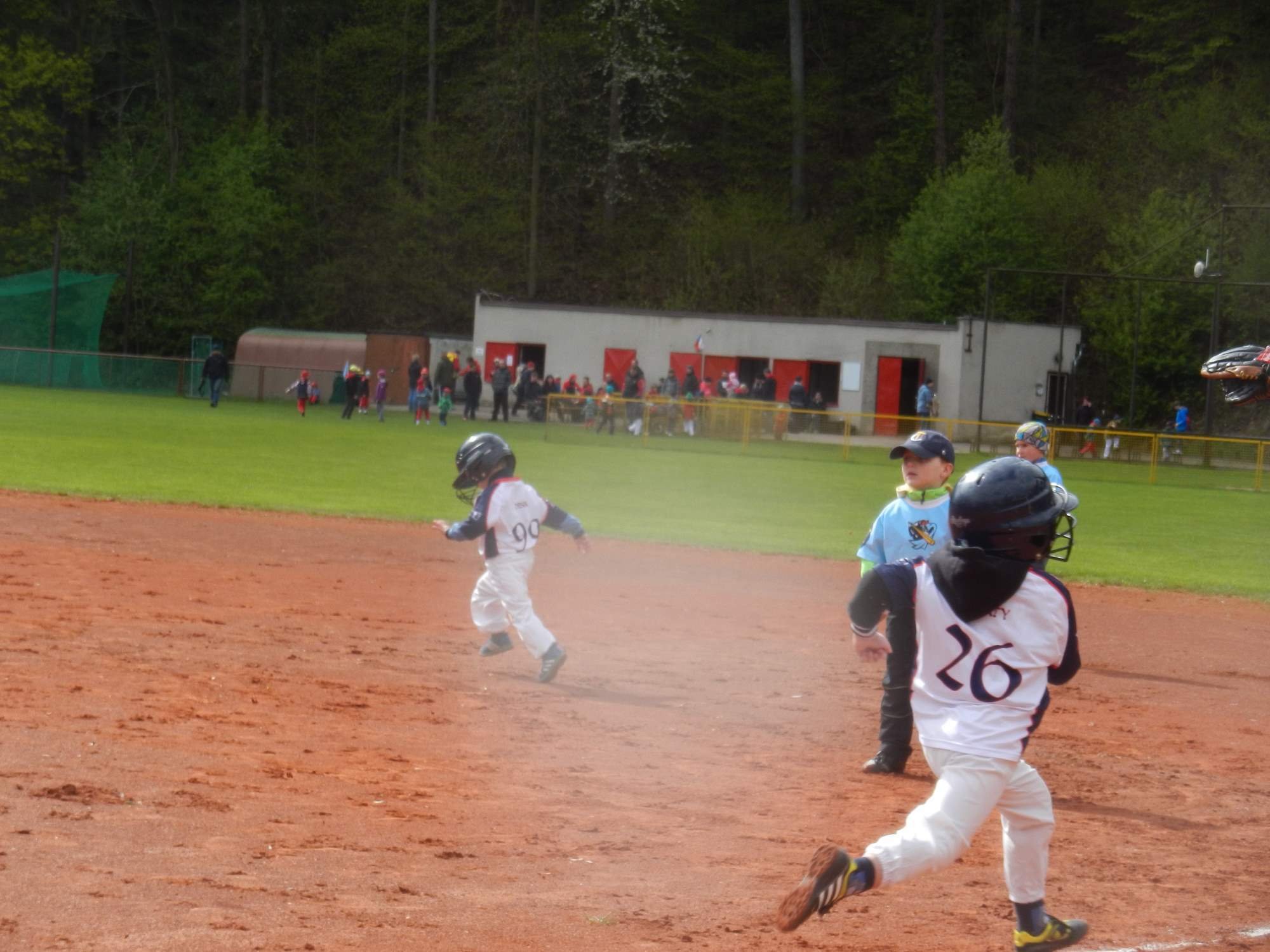 Zápas začínáme v poli. Je nás pět, takže obsazujeme pouze vnitřní pole. Rozhodčí se mě ptá, jestli máme kečra. Prstem ukážu do pole, že máme pouze tohle, ale že to klidně odkečruju já. Na kečrovi předvádím spolehlivý výkon a tajně doufám, že pokud u baseballu vydržím, že se na posledním turnaji dočkám své první medaile. Ale zpátky k zápasu. První pálkař se nám dostává na metu. Další dva jsou ale aut po ose kruh-první meta. Poté se soupeři podaří obsadit všechny mety, ale Maty šlape domácí a za stavu 0:1 jdeme pálit. Klárka je aut na jedničce, Denda, Máťa i Táďa obsazují mety. Pálit jde Amálka, Linda ji rovná u stativu, Amálka pálí a Táďa si při úprku z jedničky trochu popletl směr a místo na druhou metu si to pádí do zadního pole. Bohužel je to aut, ale dobrá zkušenost, příště už to nesplete. Když je třetí aut Klárka, jdeme za stavu 1:1 bránit. Obrana funguje naprosto skvěle a na čtyři pálkaře děláme tři rychlé auty a jdeme zase pálit. Ve druhé směně se nám opět daří stáhnout domů Dendu a za stavu 2:1 jdeme do poslední směny. První čtyři pálkaři soupeře se nám dostávají na metu, pak se ale pole uklidní, děláme tři rychlé auty a za stavu 2:3 jdeme pálit (zápis je v tomto bodě trochu nejasný, buď jsme ve třetí směně udělali čtyři auty, nebo inkasovali tři doběhy). Maty obsazuje první metu, Táďa je aut na jedna, Amálka obsazuje jedničku, Klárka obsazuje jedničku a Maty srovnává na 3:3, Denda aut na jedna, Maty obsazuje jedničku a Amálka otáčí na 4:3, Táďa obsazuje jedničku a Klárka zvyšuje na 5:3, Amálka je aut na jedničce.