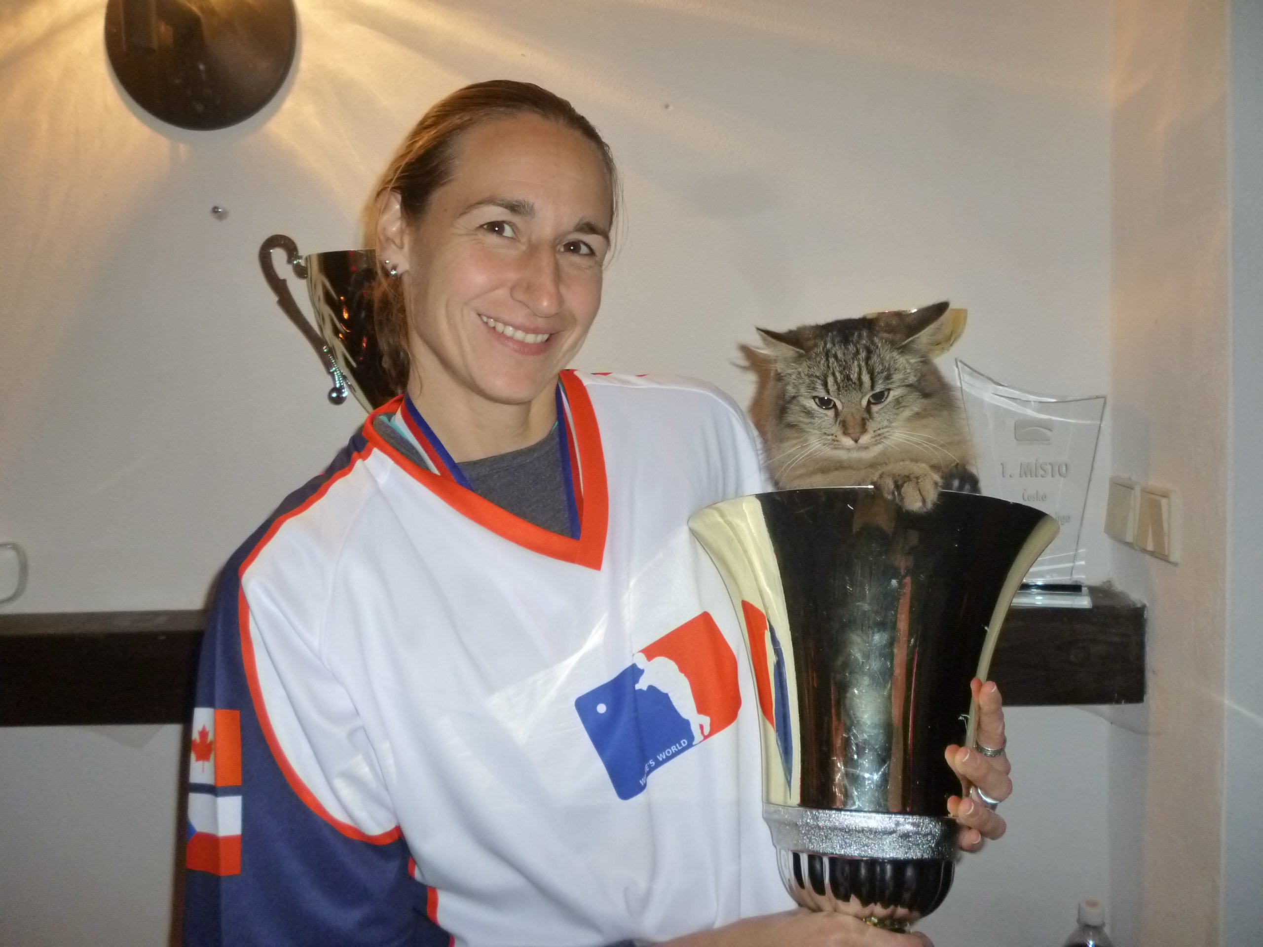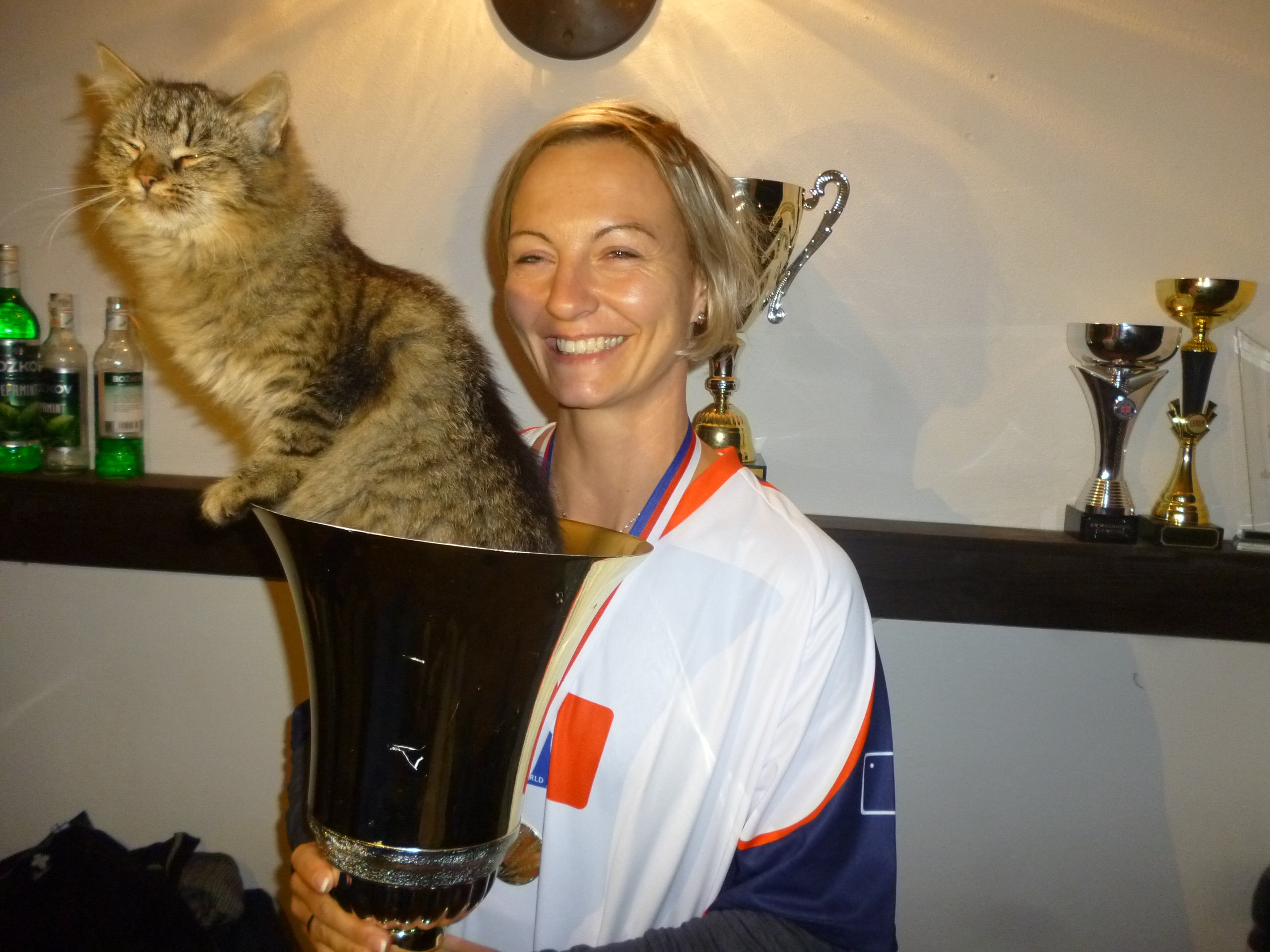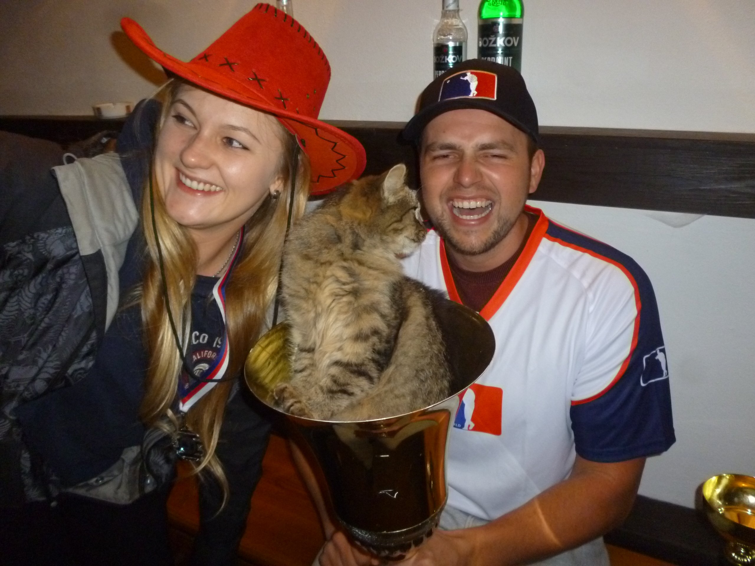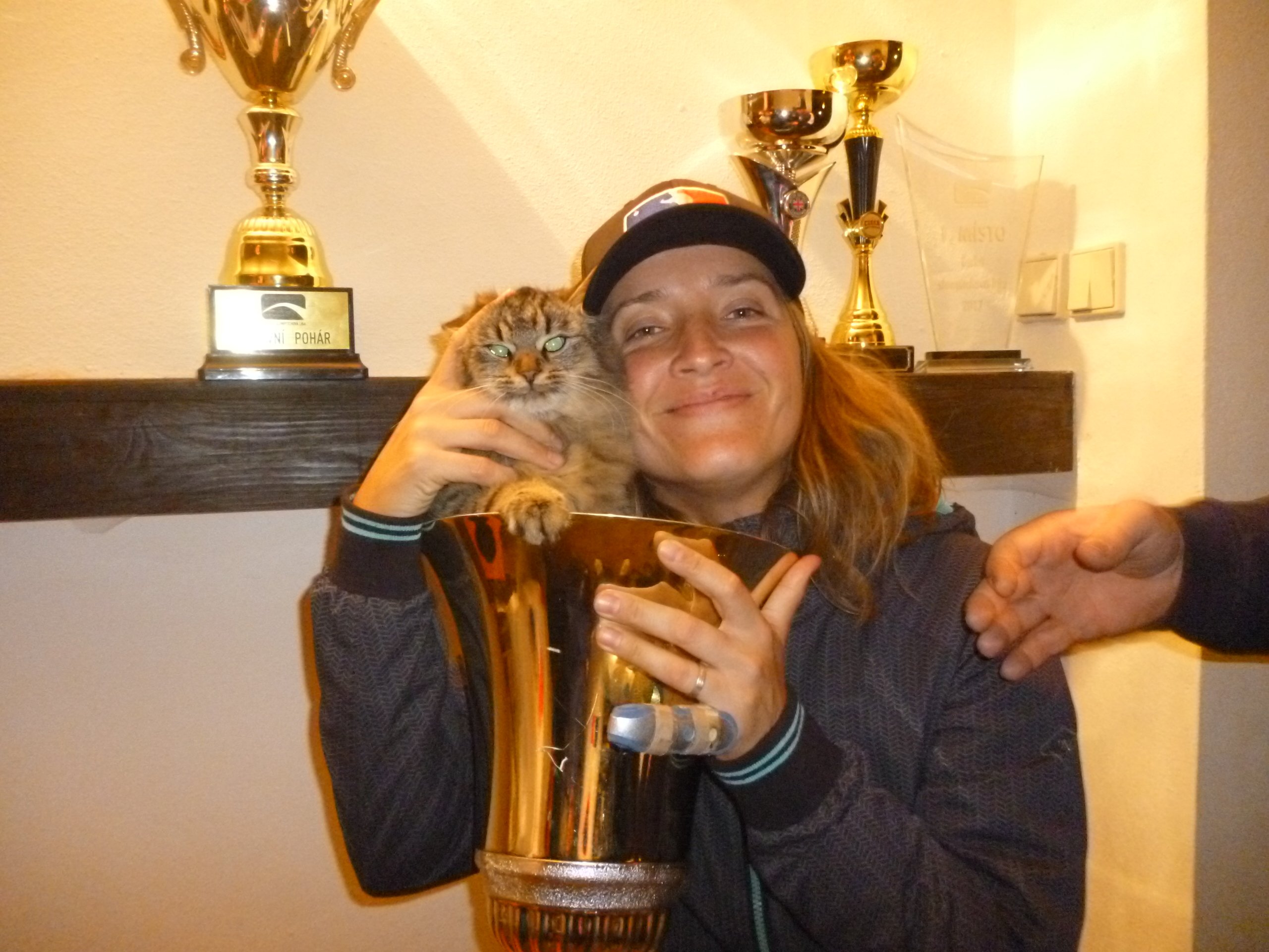 K bujarým oslavám všech letošních titulů se přidala kočka. Fotila se s námi v poháru, na dospělých jídlo loudila, dětem ho kradla. No pak ta ludra rozbila skleněnou trofej za ČSL. MJ.