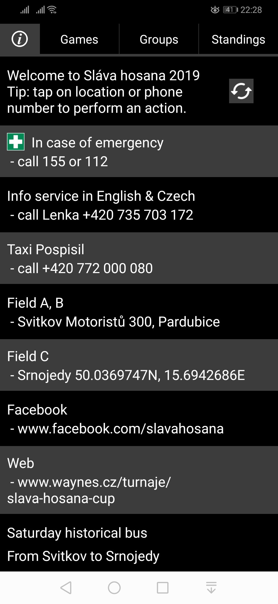 Turnaj Sláva Hosana má vlastní aplikaci pro android. Uživatelům nabízí aktuální výsledkový servis, rozpis, tabulky, důležitá telefonní čísla a jízdní řád historického autobusu. Aplikace také umí vyhledat hřiště a autobusové zastávky v mapách a v navigacích.