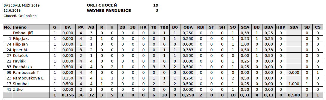 Waynes: Kůťa RF, Ondra Zítko 3B, Pepíno 3B, Lukes SS/C, Kubajs P/SS, Waynes 1B/P/3B, OLí 2B, Jirka Dohnal C/1B, Lin CF, Matěj I. LF, Šakal 3B/P