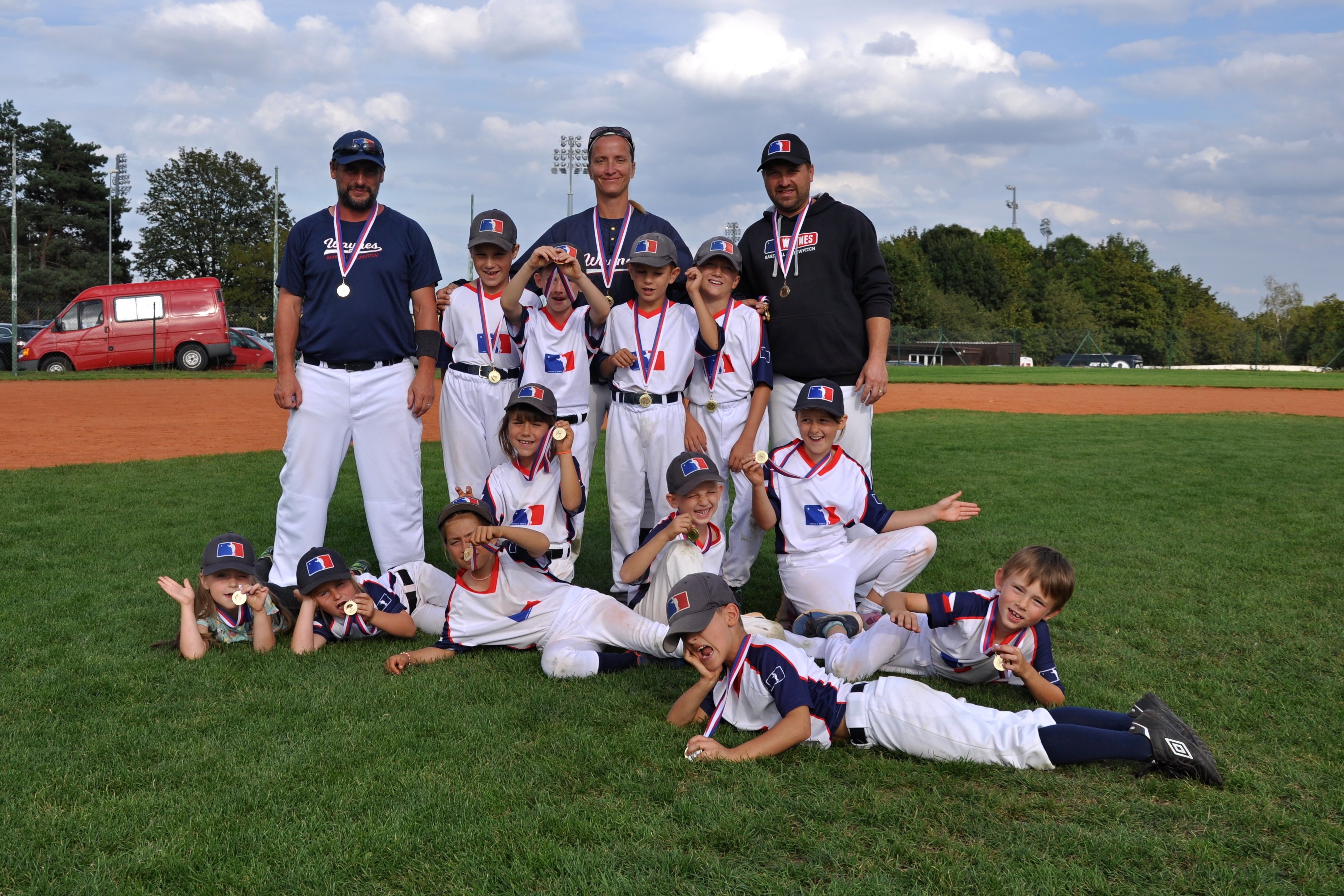 V poli hrajeme auty na první, druhé i třetí metě. Na pálku chodíme všichni. Tohle je baseball, který umíme. Line up se nezachoval.