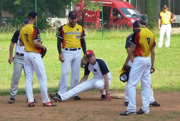Německo nastupuje spořádaně coed, my máme v sestavě jedinou dámu – Alču. Osm z devíti bodů inkasujeme po homerunech. Wolfi střílí ve druhé směně za 3 body. V pětce za plot dává nejdříve Max (RBI 3) a následně Wolfi (RBI 2). My dáváme ve třetí směně 3 body po obyčejných hitech. Německo přidá ještě jeden punkt v poslední směně, čímž se skóre stanovuje definitivně. Nelze nezmínit Romáleho parádní robinzonádu, které tleska nejen soupeř, ale i všech 14 přihlížejících diváků.