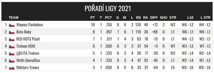 Waynes Pardubice | 6 | 4 | 2 | 78 : 33 | 10 |