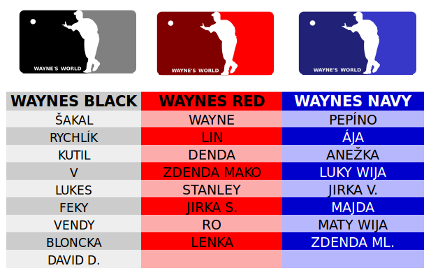 Wayne (Red) měl v plánu vyměnit Dendu za první volbu (bral by LW) a Dendu dodraftoval později, ale nakonec změnil strategii a vybral všechny padesátníky (Stanley, Ro a Lenka), čtyřicátníka Zdendu Mako a Jirku Strouhala. Patra postarších čiloušů se ukázala být jako nejsilnější kombinace: dvě výhry, jedna plicha, jedna prohra a lepší bilance s Black, kteří měli trochu smůlu, když v posledním zápase přišli o Lukese. Ale co by to bylo za turnaj, kdyby se Lukes nezranil?