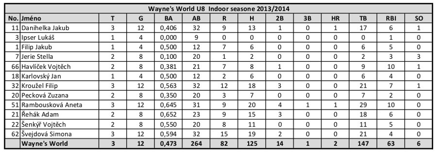 V baseballu se všechno počítá. Pokusím se vypočítat, co všechno přinesla zimní příprava našich dětí. Všechno začalo 3. října 2013. Na první trénink přišlo pět kousků: Kutil, Loko, John, Ondra a Áňa. Od listopadu jsme trénovali už 2x týdně. Počet hračů pomalu narůstal až na současný stav (22 hráčů před přechodem ven).