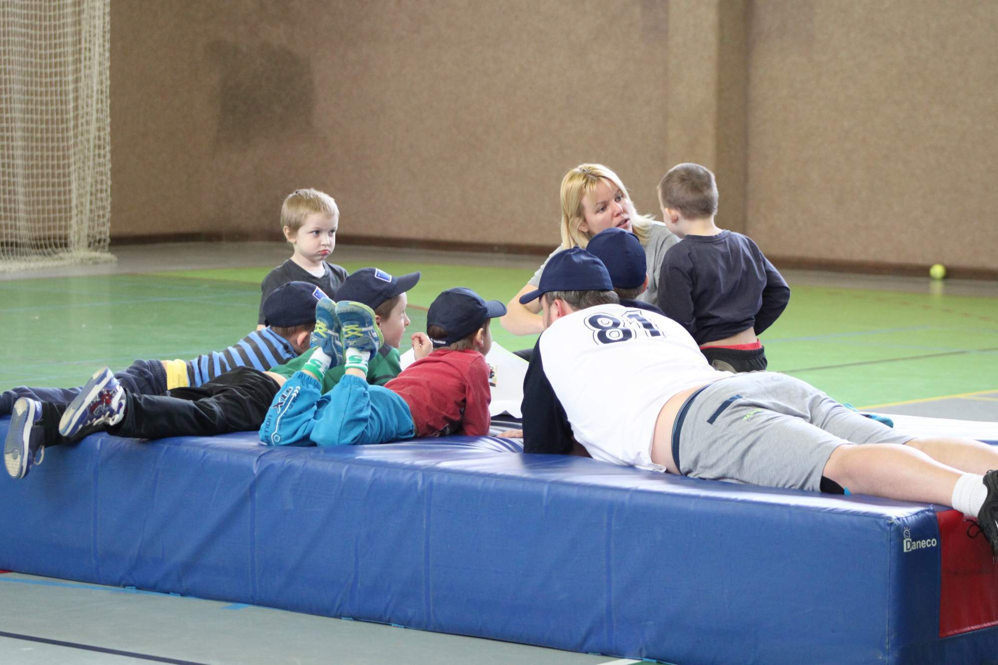 Na desátou se přesouváme opět do haly na druhý trénink (3 hodiny). K obědu máme kuřízek s okurkovým salátem z Moťáku. Polední klid většina trpaslíků tráví baseballem