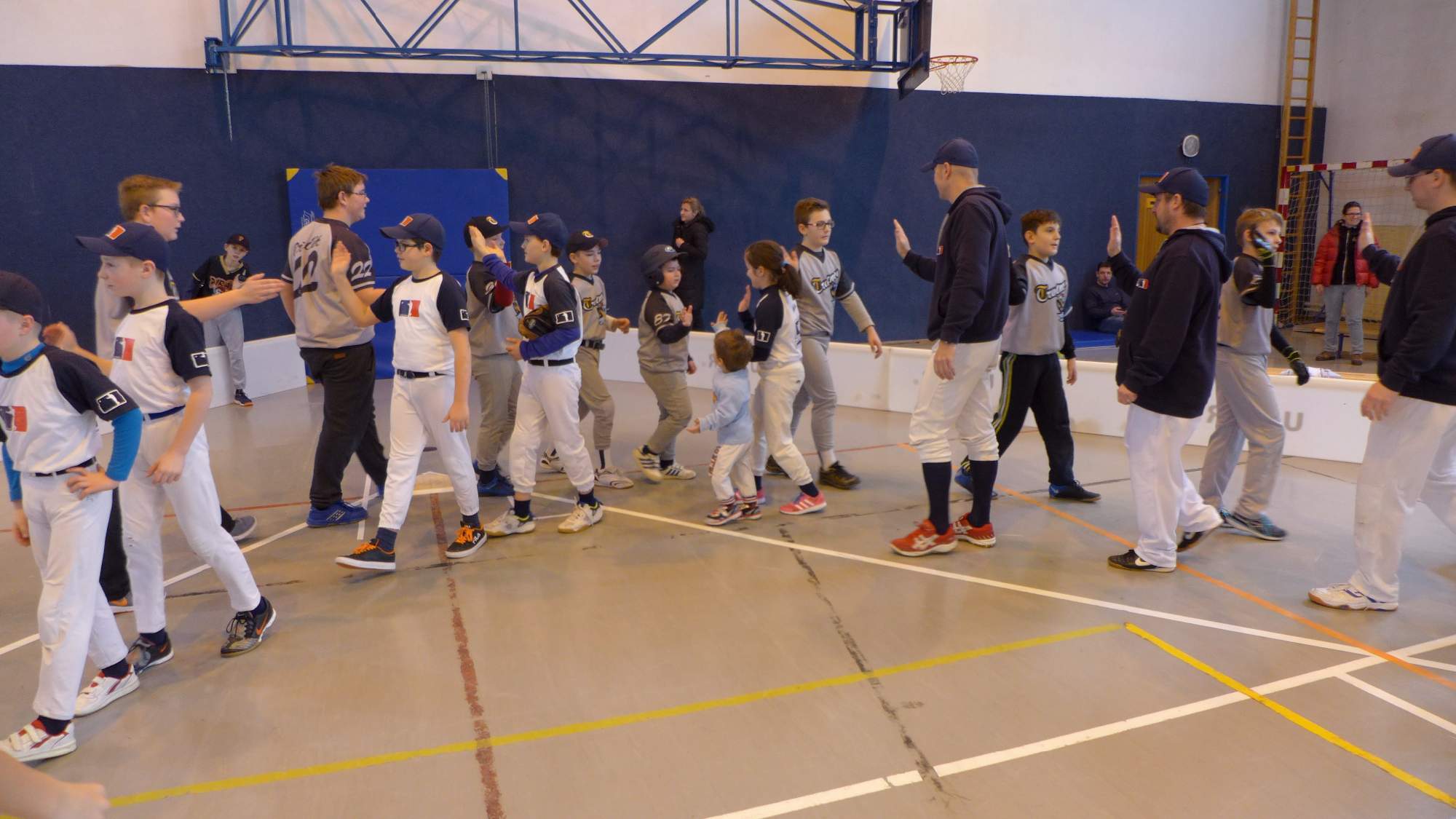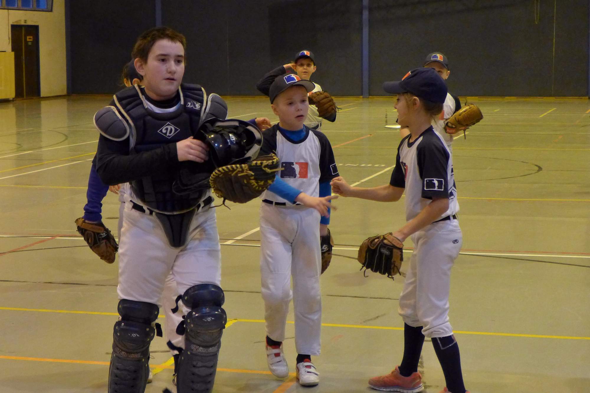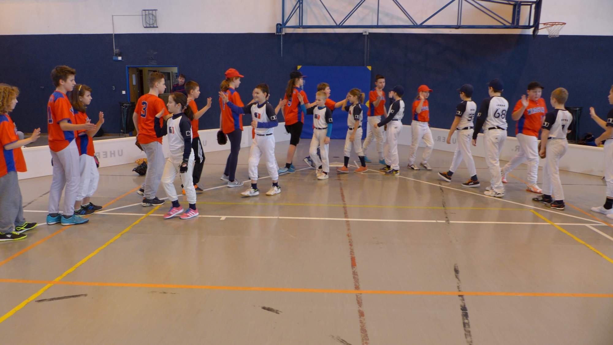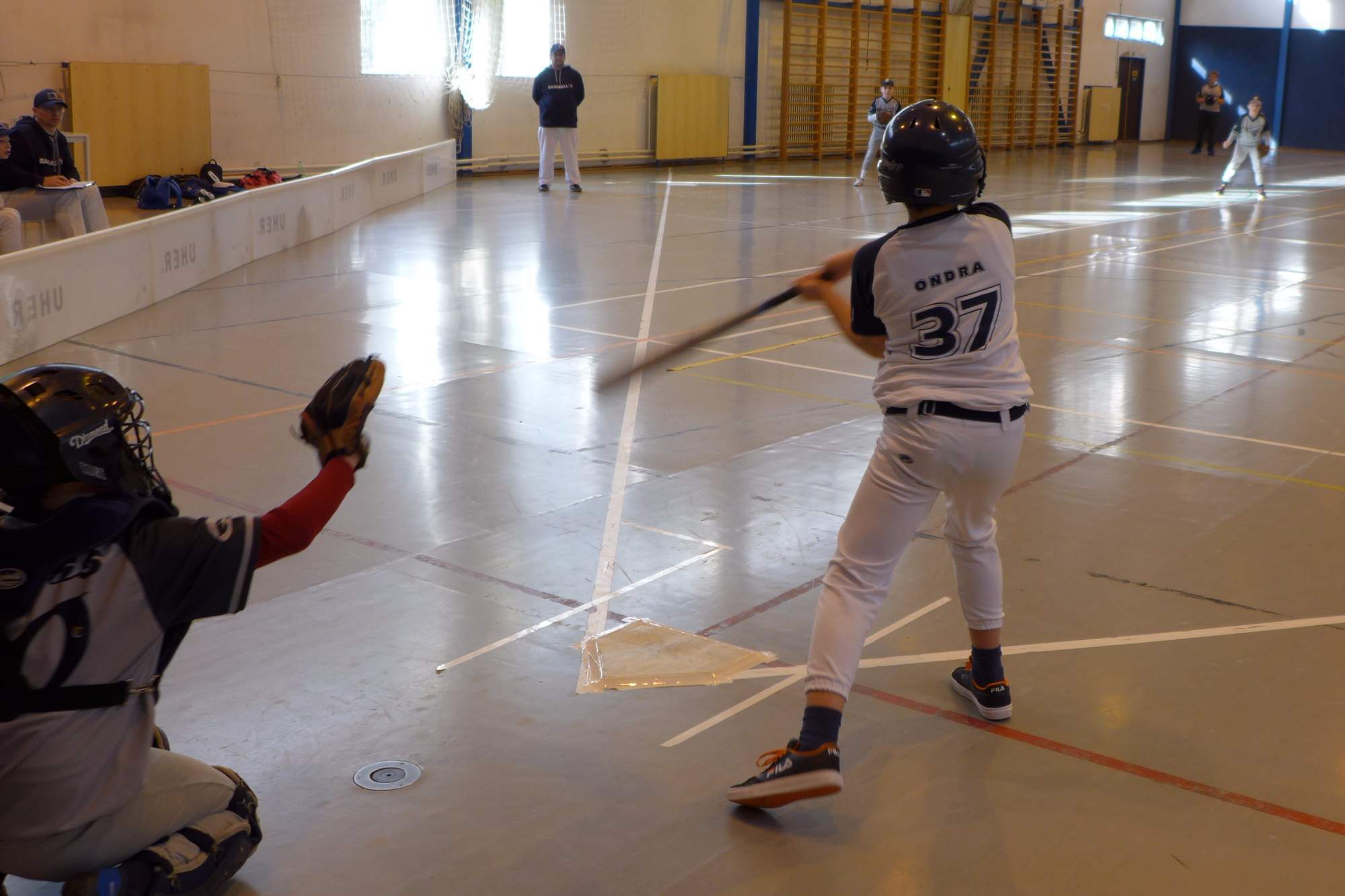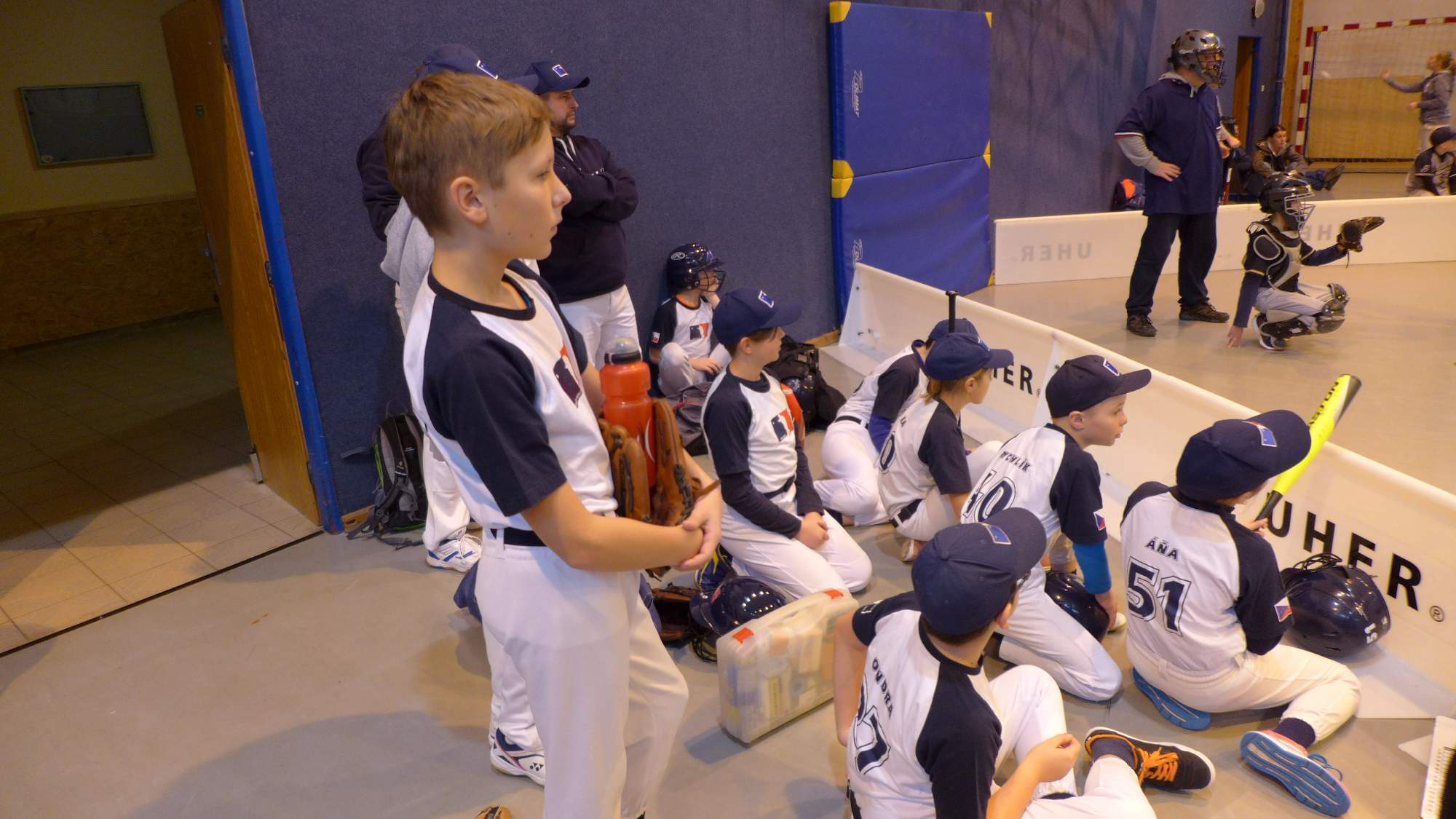 Kategorie U13 nadhazuje z kopce. V tomto případě i v hale. Nikdy jsme to neviděli, natož aby jsme to trénovali. Zíráme jak puberťák na nudapláži.
