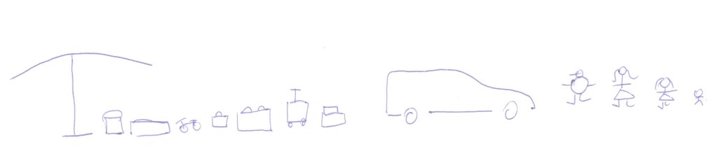 Měli jsme si koupit vejtřasku nebo alespoň dvanácetrojku. Do Novouše se jako vždycky ne a ne vejít: dvě dlaždice, stojan, skunečník 4×4, plachta 6x3m, postýlka, kočárek, …