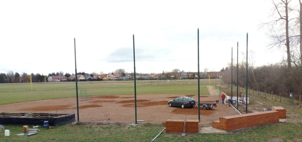 Výstavba areálu pokračovala i v listopadu. Momentálně se pracuje na zabudování sloupů pro backstopy a foul ball sloupů. Na poslední brigádě jsme oseli třetí hřiště a tráva už roste.